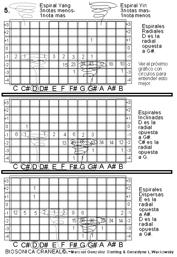 5.- Podemos encontrar cuatro notas relacionadas formando otras dos espirales: una Yin y la otra Yang, que compondrían una interacción posterior entre las seis notas mayores y las seis notas menores. Una espiral Yang que toma información del lado Yin hacia el lado Yang, tres notas carentes y una nota en exceso formando una espiral centrípeta que se concentra en la dirección contraria a las agujas del reloj. La otra espiral Yin toma la información del lado Yang hacia el lado Yin con una nota carente y tres notas en exceso formando una espiral centrífuga que se dispersa en el sentido de las agujas del reloj. Relacionando las tres notas con la otra, nos dará mayor entendimiento en la relación entre las funciones del cuerpo y los órganos. Debido a las contadas veces que somos capaces de emitir una nota pura, si atendemos al análisis que tiene lugar, de repente, con un simple sonido, estamos pronunciando tres notas juntas. Si relacionamos tres notas con una que se opone nos dará una interpretación holística de la investigación existente. Esto está siendo desarrollado por Marisol González Sterling de Biosónica Craneal. Al igual que la doble hélice tiene filamentos entre sus dos hebras portando información de un lado a otro en las cadenas de ADN, podemos contemplar estas espirales permitiendo mayor coherencia y organización o mayor incoherencia y desorganización.
