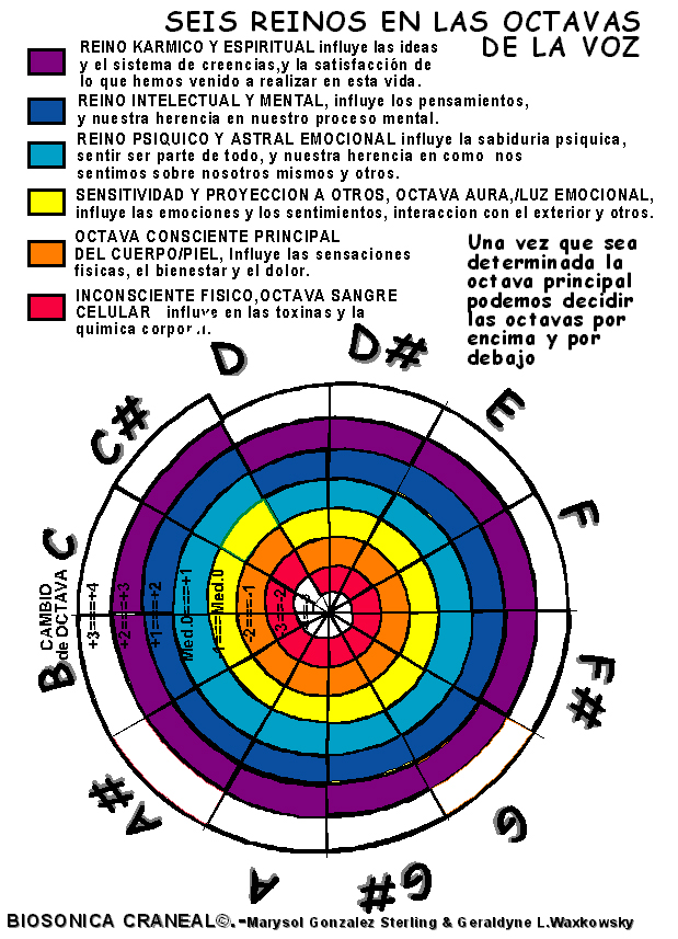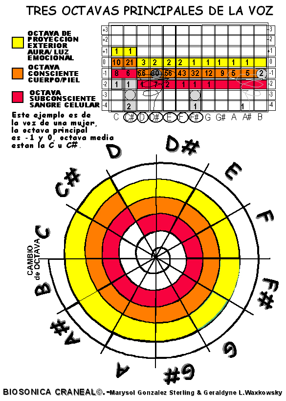 Esto es donde se encuentra la mayoría de la voz, como un sonido de una vocal mantenido, que es por que el análisis del tipo del Afinador Cromático, anteriormente el Korg, nos da, ya que solo nos dará esas frecuencias que pertenecen al sonido de las cuerdas vocales y en el programa de BioSonica facilmente se reconoce como la octava principal de la voz, donde cada nota dio más puntos. Si nosotros miramos todo las notas en sus octavas es siempre una continua espiral y la octava principal aunque esté en dos octavas tiene la forma continua de una sola octava vista en espiral, Aunque algunas notas estén en una de las octavas que definimos en la escala y las otros caen en otra octava más por debajo. Si nosotros vemos esto en un círculo espiral como es realmente en el octavas progresivas, una conectada con la próxima, podemos ver claramente ese B,SI en la octava -1 continúa a el C,Do en Octava Media, o Octava 0, y la B,Si en la octava Media continúa a la C,Do de octava +1. Podemos ilustrar claramente esto en el próximo gráfico. La mayoría de los Afinadores Cromáticos no recogen la voz hablada, únicamente cuando se canta y se da una nota o frecuencia que se mantiene por un rato, al comienzo de esta tecnologia de análisis de voz nosotros habiamos elegido anteriormentel la marca Korg porque lo es el Afinador Cromático para recoger la mayoría de la voz hablada, cuando los otros solo recogen la voz cantada, o una nota sostenida por un largo periodo de tiempo, porque lo que realmente recoge es cada vez que retenemos una frecuencia por un cierto tiempo como si nosotros tarareamos. Ahora con el afinador de tipo Korg por ordenador el programa de BioSOnica no perderemos ninguna de las frecuencias fundamentales que salen de las cuerdas vocales de la voz hablada. Por eso nuestra voz toma la tonalidad de la octava principal, aunque tenemos tantas otras frecuencias por en octavas por encima que no convierten la voz en un tono mas alto.