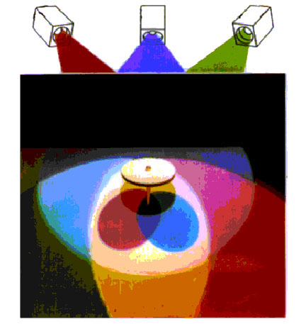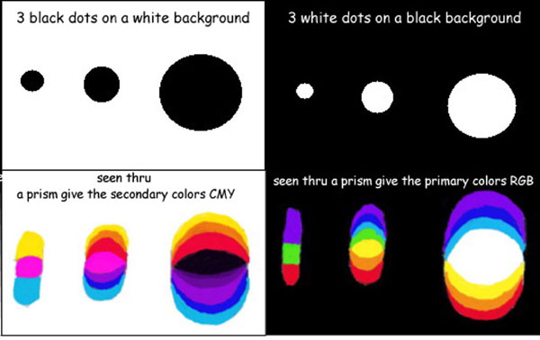 El rojo, el verde y el azul violeta (RGB en inglés), son los colores primarios, y sus combinaciones se convertirán en el blanco de la luz, transparente y coherente. El cian, el magenta y amarillo (CMY en inglés) son los colores secundarios, y su combinación dará lugar al negro del pigmento, materia e incoherencia. Podemos ver cómo tres luces de los colores primarios se vuelven luz blanca donde se mezclan juntos y si ponemos un objeto o cualquier objeto físico en el centro de esta luz blanca, en este caso una plataforma redonda pequeña, los colores combinados de luz tendrán una sombra compuesta de los tres colores secundarios. Podemos ver las posiciones de las polaridades, la luz roja da una sombra cian, la luz verde da una sombra magenta y la luz azul-índigo da una sombra amarilla, los complementarios exactos cian-rojo, verde-magenta, azul-índigo-amarillo. También los carentes de los 3 colores secundarios darán finalmente una sombra negra oscura. Esto demuestra que los colores primarios van hacia la luz coherente blanca y los colores secundarios hacia el pigmento en blanco incoherente.