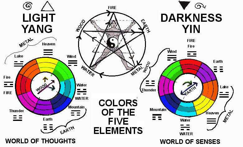 Al decidir los colores que pertenecen a cada uno de los trigramas, la teoría de los 5 elementos tomó vida. El metal es amarillo y naranja, el cielo y el lago en lugar de blanco. El Fuego y el agua siempre son rojos y el cian del agua antes era azul. La Tierra ha cambiado a la oscuridad material del violeta y el azul, de la Montaña, en lugar del amarillo. Y la Madera es aquellos colores del centro y de la unión de ambos rayos, el verde del Viento, y el magenta del el trueno. El verde siempre era la Madera y el Hígado. A la madera pertenecen los trigramas que transforman las fuerzas de la naturaleza transformándolo en vida bi- u7jológica.
