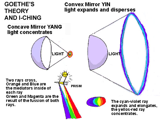 Johann W. Goethe, usó espejos cóncavos y convexos y observó el halo de colores que entrarían fuera del margen del color proyectado, y es interesante cuando lo compara a la teoría del yang de yin. También, explicó cómo los colores prismáticos son divididos en dos rayos, uno cian-violeta como YIN, frío, alcalino, se separan, se marchan y abren centrífugamente. El otro rayo es rojo-amarillo como YANG, caliente, ácido, se unen, mueven más cerca y se concentranl centrípetamente. Cada rayo se abre pareciendo anaranjado en el rayo Yang y azul en el rayo Yin, como el principio de separación y radiación. Ellos también funden dando verde y magenta juntos, como el principio de unión y absorción. Los ocho colores de la octava son rojo-naranja-amarillo-verde-cian-azul-violeta y magenta para convertirse en la siguiente octava, y ellos también se representan por los ocho trigramas del I-Ching, el libro antiguo taoísta chino. Siempre el Amarillo se expande no viendo donde acaba en un fondo blanco y es la mayoría Yang del rayo Yang. El rojo entra de fuera de un fondo negro en el rayo de Yang así que es el más oscuro y más Yin del rayo Yang. Entonces el Cian está al lado de un fondo blanco en el rayo Yin así que la mayoría Yang del rayo Yin, y el violeta está al lado de un fondo negro y se expande no siendo capaz de distinguir cuándo acaba y se funde con el negro, es la mayoría Yin del rayo Yin.