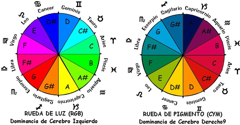 En una rueda tenemos DO como rojo para el principio de absorción del sonido en el sentido de las agujas del reloj en el movimiento de la rueda, en el otro C, DO es cian verde para el principio de la radiación de la luz en sentido contrario a las agujas del reloj en el movimiento de la rueda.