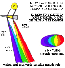 Ha hecho una síntesis de los experimentos de GOETHE con la luz y las octavas del I-CHING, y después con los meridianos de acupuntura. Hay siempre dos rayos que surgen en cualquier refracción, un rayo cian-violeta que sale del ángulo más pequeño del prisma, por lo que mantiene un longitud de onda pequeña-rápida, y un rayo rojo-amarillo que sale a través de la parte más gruesa del prisma, con una longitud de onda larga- lenta. Si el rojo-amarillo se expande tenemos naranja en el centro, y si el cían-violeta se expande tenemos azul en el centro. En la posición de enfoque del prisma ambos rayos se cruzan mezclándose el amarillo y el cían dando verde, que es la fusión de ambos rayos a través del centro, y la fusión de ambos rayos a través del otro lado dará el magenta al unir el rojo y el violeta. Por eso magenta y verde son tan brillantes e intensos, porque están compuestos de los dos rayos.