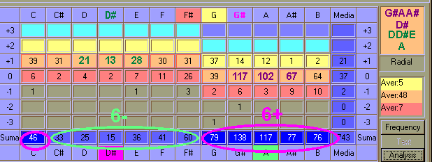 Al tener más puntos en las notas centrales desde Re# a Sol# (con aproximación ya que pueden moverse ligeramente hacia las notas del principio o del final), te involucras en profundidad en aquello que estas haciendo. Quizás comiences muchas cosas y no tengas tiempo de terminarlas. Se te relaciona con una cualidad emocional obsesiva, con el modo Fijo y las características del elemento tierra, donde la obsesividad, la compulsividad y la concentración, así como la flexibilidad, puede ser una virtud si te ayuda a terminar las cosas, o puede ser un negativo al no escuchar a nada ni a nadie. La persistencia y fortaleza pueden ser las mejores expresiones, pero esparcirse en demasiadas cosas hará difícil que puedas terminarlas.